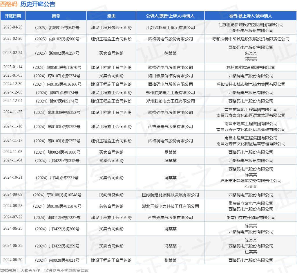 案号:(2025)内0102民初906号审理法院:呼和浩特市新城区人民法院案由:建设工程施工合同纠纷当事人信息: 原告/上诉人:西格码电气股份有限公司 被告/被上诉人:呼和浩特市昕城建设发展投资有限责任公司开庭日期:2025年2月26日根据统计,近一年内以西格码电气股份有限公司为当事人的历史开庭公告有32则,其中案由为“建设工程施工合同纠纷”的公告以10则居首,其次为“买卖合同纠纷”有9则,“劳务合同纠纷”有4则。历史开庭公告(前20条)如下: